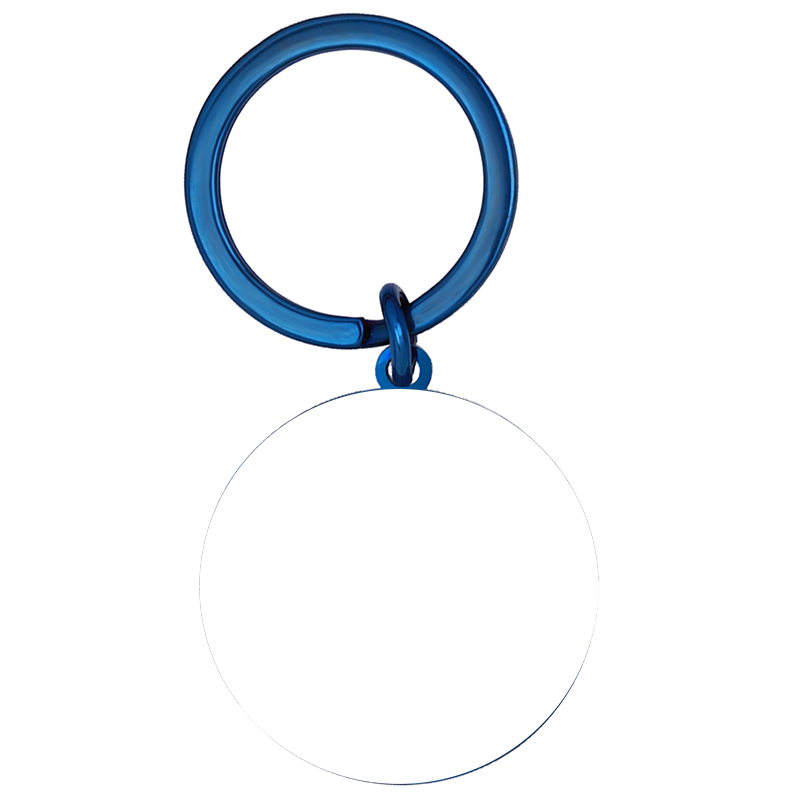 Breloc albastru in forma de banut rotund, realizat din inox, personalizat prin gravura laser exact asa cum vrei! Personalizeaza produsul cu poza, simboluri sau mesaj.