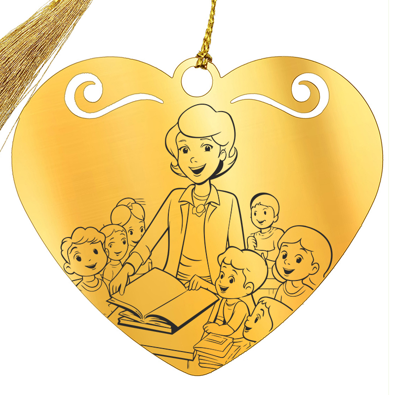 Decoratiune Craciun in forma de inima, realizata din inox auriu, personalizata prin gravura laser cu mesajul tau pentru doamna educatoare, invatatoare sau profesoara si un desen simpatic potrivit pentru dansa. Bradul tau de Craciun va arata spectaculos anul asta.