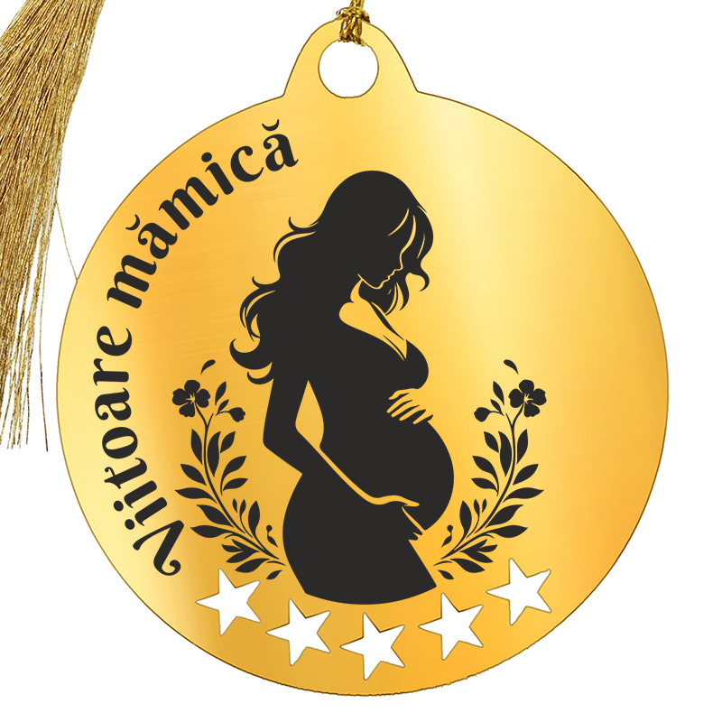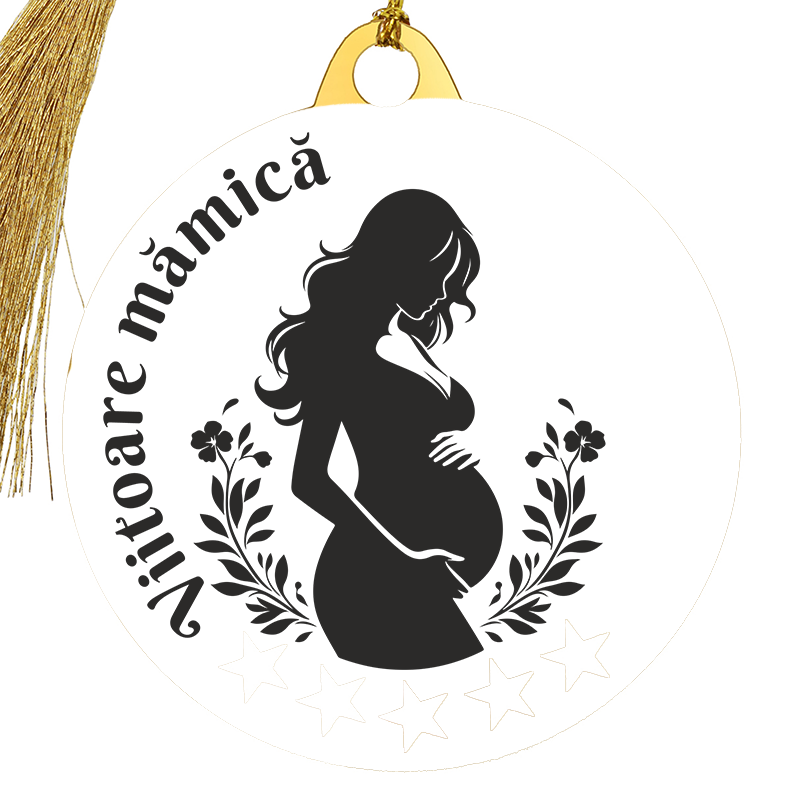 Decoratiune Craciun in forma de glob cu perforatii stelute, realizata din inox auriu, personalizata prin gravura laser cu silueta unei gravidute, ornamente, mesajul Viitoare mamica si nume/ data. Stralucitoare si eleganta, decoratiunea va impresiona atat prin poveste cat si prin aspect. Bradul tau de Craciun va arata spectaculos anul asta. Un cadou ce isi poate adapta utilitatea si dupa sezonul de Sarbatori, transformandu-se intr-un elegant semn de carte sau accesoriu pentru agenda. Realizata din otel inoxidabil, atat gravura cat si culoarea bazei isi vor pastra in timp aspectul si culoarea. Cadoul este ambalat direct pentru a fi pus sub brad!