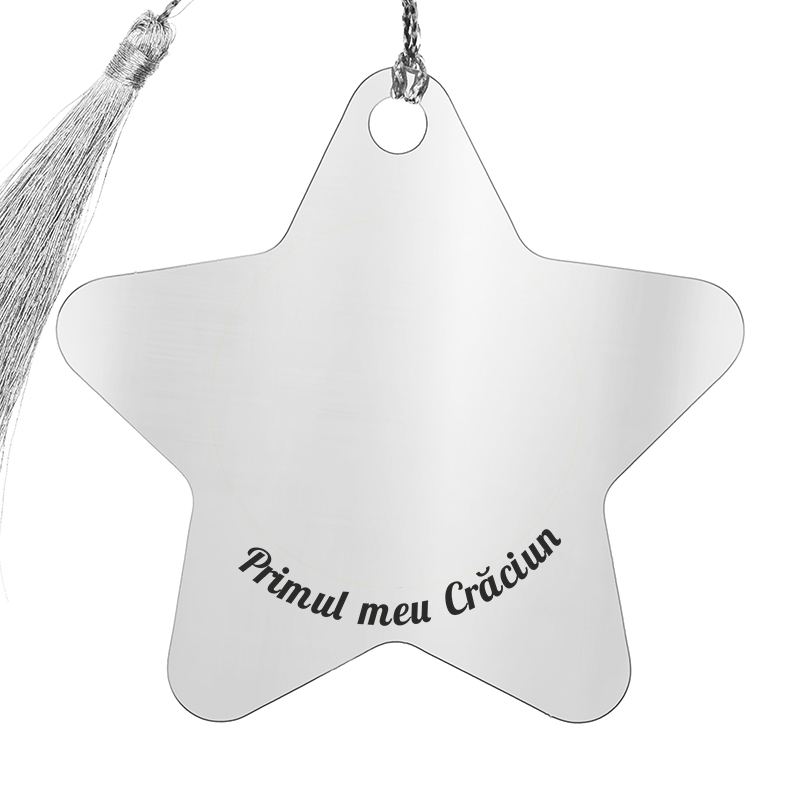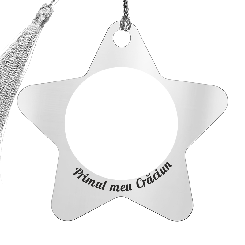 Decoratiune Craciun in forma de stea, realizata din inox argintiu, personalizata prin gravura laser cu anul, mesajul Primul meu Craciun si poza bebelusului tau. Stralucitoare si eleganta, decoratiunea va impresiona atat prin poveste cat si prin aspect. Bradul tau de Craciun va arata spectaculos anul asta. Un cadou ce isi poate adapta utilitatea si dupa sezonul de Sarbatori, transformandu-se intr-un elegant semn de carte sau accesoriu pentru agenda. Realizata din otel inoxidabil, atat gravura cat si culoarea bazei isi vor pastra in timp aspectul si culoarea. Cadoul este ambalat direct pentru a fi pus sub brad!