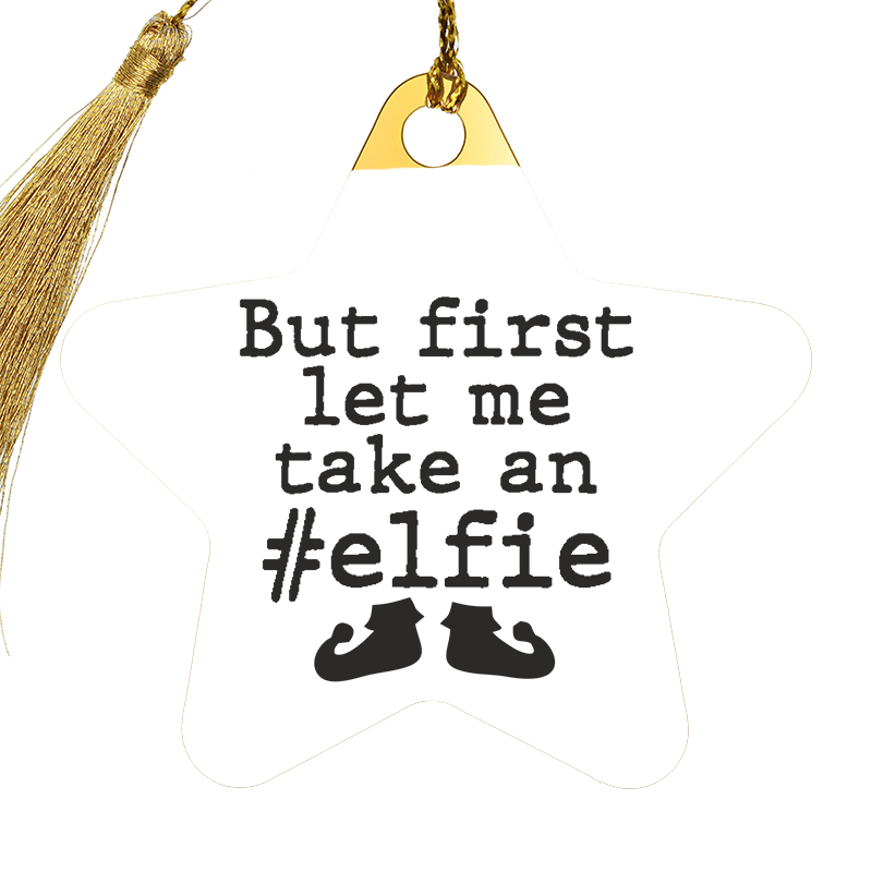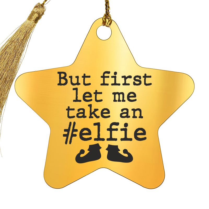 Decoratiune Craciun in forma de stea, realizata din inox auriu, personalizata prin gravura laser cu anul si mesajul But first let me take an elfie. Un cadou super simpatic pentru creatorii de continut si pasionatii de social media. Stralucitoare si eleganta, decoratiunea va impresiona atat prin poveste cat si prin aspect. Bradul tau de Craciun va arata spectaculos anul asta. Un cadou ce isi poate adapta utilitatea si dupa sezonul de Sarbatori, transformandu-se intr-un elegant semn de carte sau accesoriu pentru agenda. Realizata din otel inoxidabil, atat gravura cat si culoarea bazei isi vor pastra in timp aspectul si culoarea. Cadoul este ambalat direct pentru a fi pus sub brad!