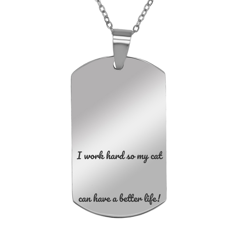 Colier army din inox de culoare argintie, personalizat prin gravare laser cu silueta unei pisicute, mesajul I work hard so my cat can have a better life si numele animalului tau de companie.