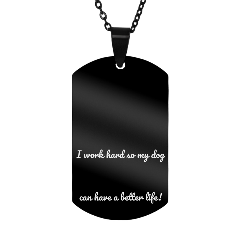 Colier din inox de culoare neagra, personalizat prin gravare laser cu mesajul I work hard so my dog can have a better life, numele animalutului tau si silueta unui catel! Un cadou incarcat cu emotie potrivit pentru persoana iubita, membrii familiei, prieteni sau oricare alta persoana draga iubitoare de animale. Inspirat de forma placutelor militare, colierul este un cadou potrivit domnilor adepti ai unui stil nonconformist care apreciaza accesoriile cu personalitate. Colierul este realizat din otel inoxidabil de cea mai buna calitate asa ca poti sta linistit, nici gravura nu isi va pierde din intensitate si nici colierul nu isi va schimba culoarea in timp. Vei primi cadoul ambalat elegant in pouch si punga cadou astfel incat il poti darui imediat ce ajunge la tine.