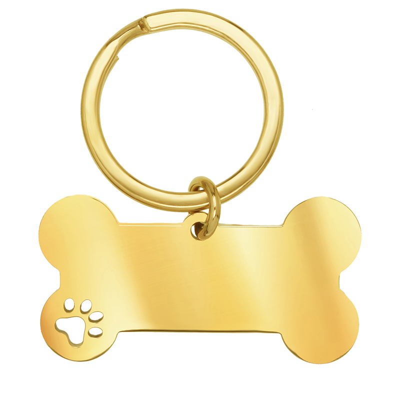 Medalion din inox auriu in forma de os cu perforatie in forma de labuta de catel, personalizat prin gravura laser cu numele animalutului tau de companie si cu mesaj si numar de telefon pe verso. Brelocul poate fi purat atat ca si accesoriu langa chei cat si ca tag/ pandantiv la zgarda cainelui tau. Realizat din otel inoxidabil, cadoul nu isi va schimba culoarea in timp iar gravura isi va pastra intensitatea pentru totdeauna. Vei primi brelocul ambalat pentru a fi daruit cadou.